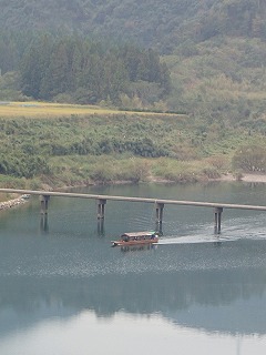 橋を渡って右岸を走っているとちょうど屋形船が橋をくぐりました。