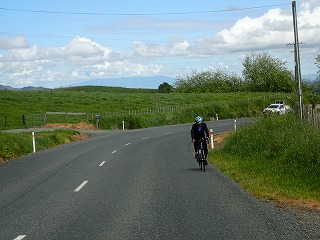 空は広く、緑の牧場が広いので、平らに見えるのですが、実はなかなかの坂道