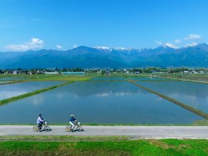 新緑が美しく、アルプスの峰々には残雪も眺められる信州白馬と安曇野を1泊2日のサイクリング